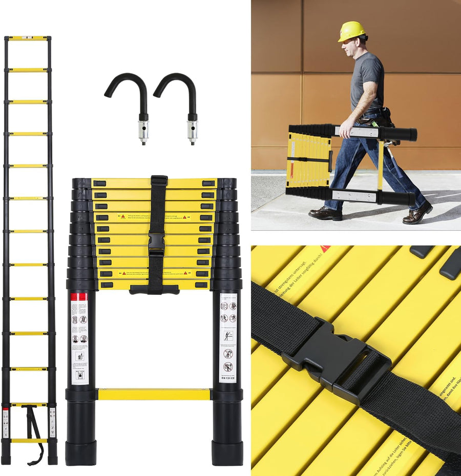 Eulenke 3,8M Teleskopleiter - Rutschfester Aluminium Multifunktionsleiter mit 2 Haken - Ausziehleite
