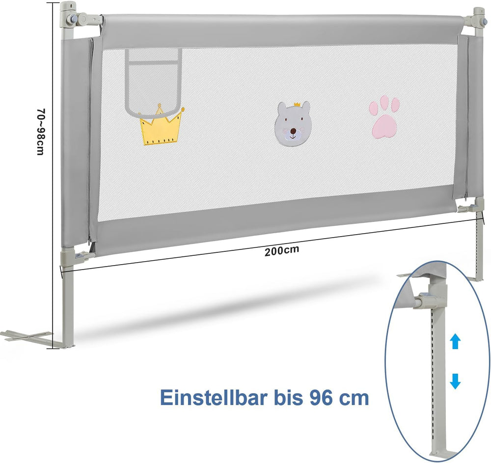 Eulenke 200cm Bettgitter, Bettschutzgitter für Kinderbett, Höhenverstellbar von 70-98cm, Rausfallsch