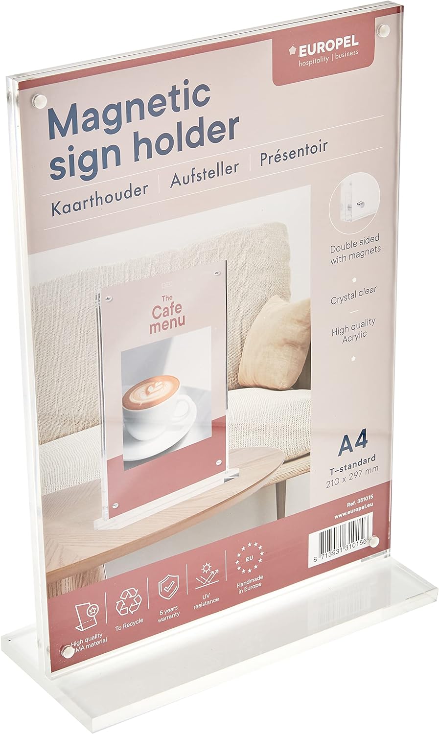 EUROPEL Luxe Tischaufsteller DIN A4, T-Aufsteller, mit Magnete, Hochformat, Acryl, Speisekarten & Pr