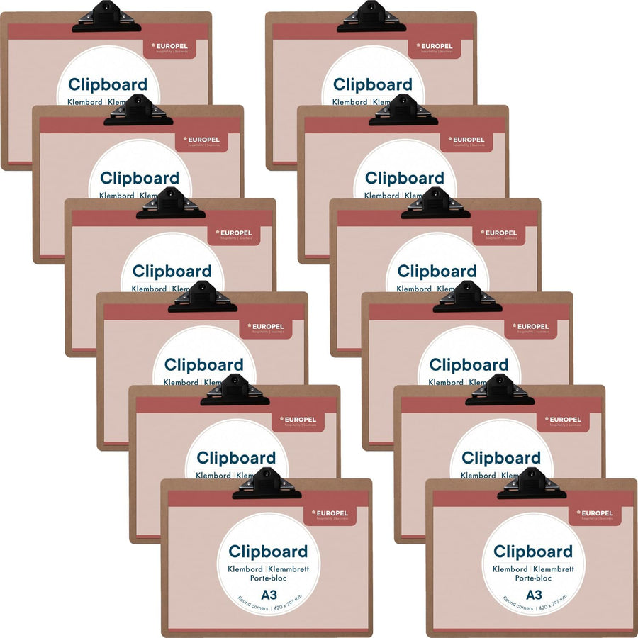 Europel Klemmbrett aus Holz, A3, Querformat, 12 Stück, FSC-zertifiziert, MDF, mit schwarzem Metallcl