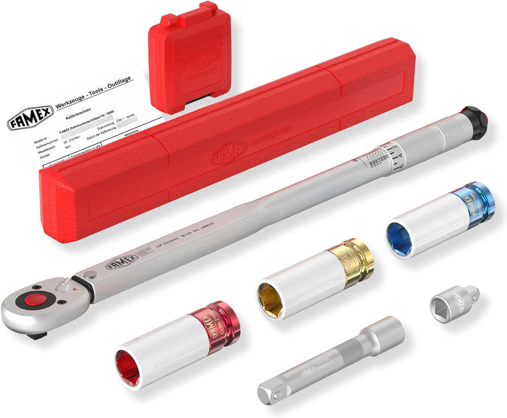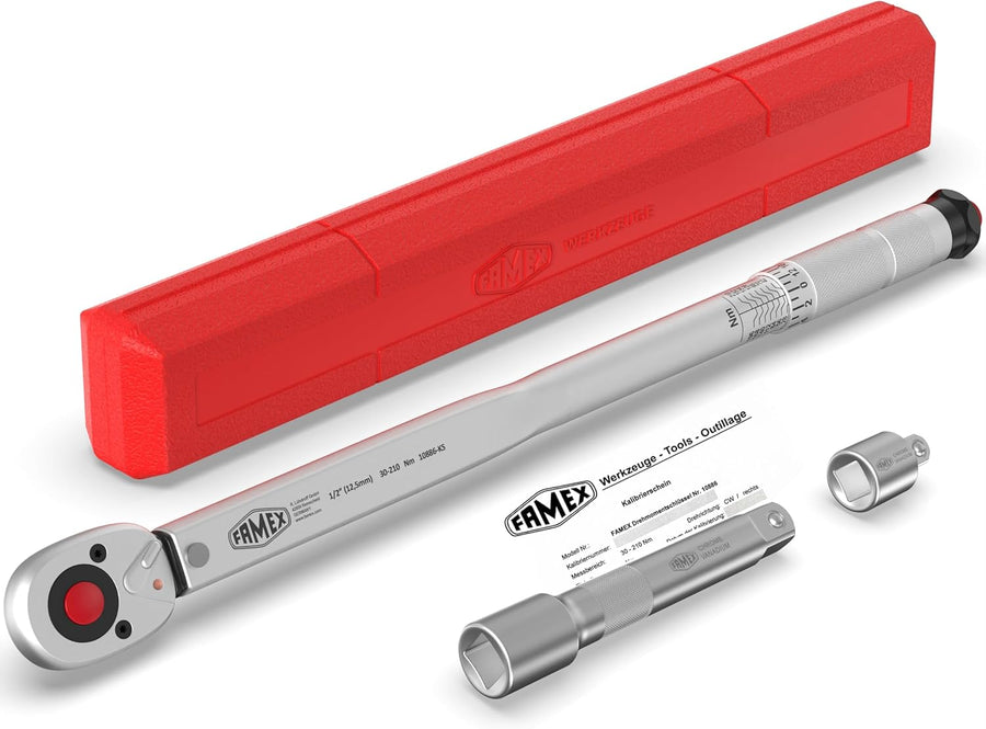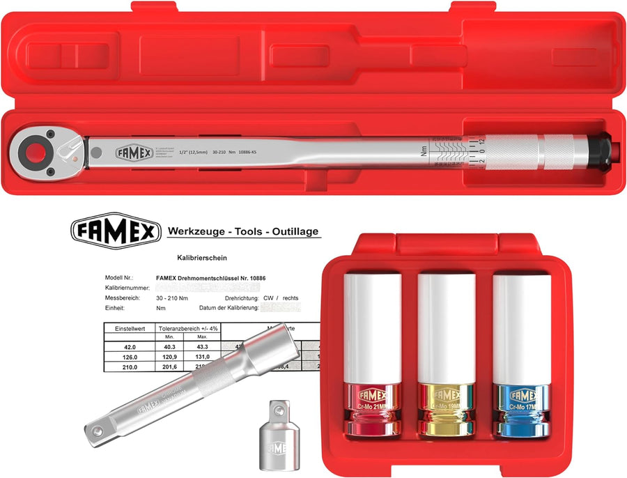FAMEX 10886-3N-KS Drehmomentschlüssel 1/2" (12,5mm) | 30-210 Nm mit Kalibrierschein - Sparset mit Sc