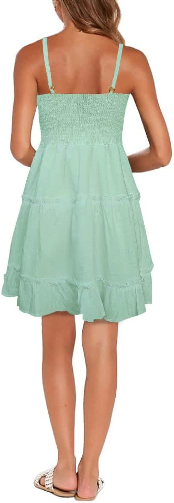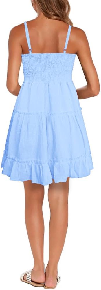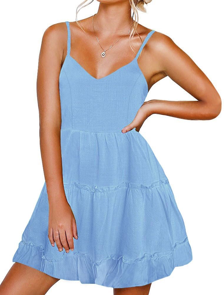 FANCYINN Damen Kleider mit V-Ausschnitt und Spaghettiträger Rückenfreies ärmelloses Blumenkleid Rüsc