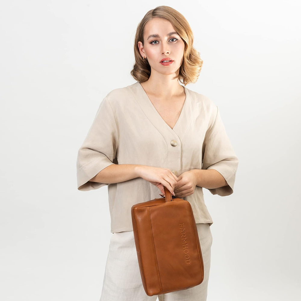 FARMHOOD Memphis Damen/Herren XL Leder Kulturbeutel | mit 2 Hauptfächern | Kosmetiktasche 30 cm Came