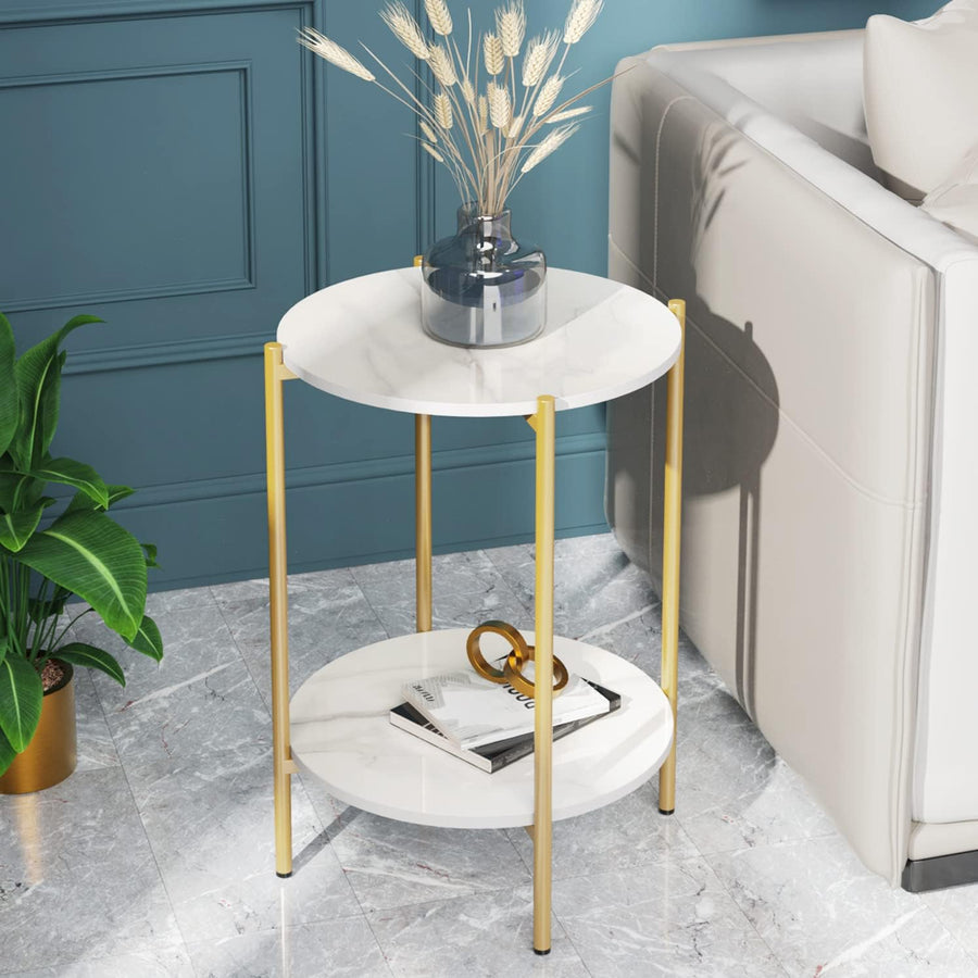 FATIVO Beistelltisch Gold Marmor Rund: 2-Ablagen Skandinavisch Beistelltisch Weiss Nachttisch 40.5×4