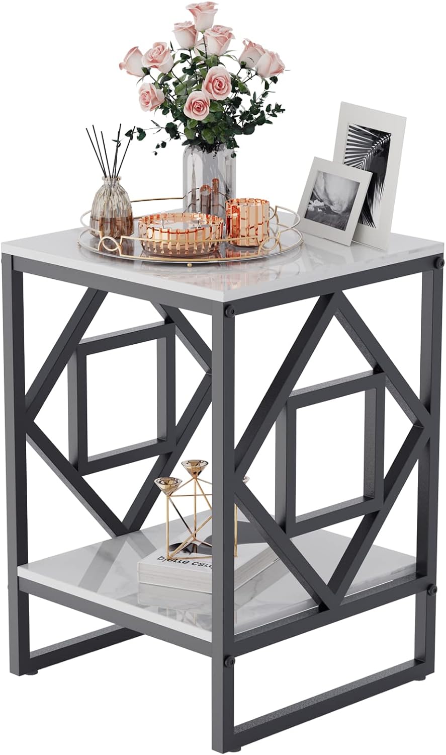 FATIVO Beistelltisch Nachttisch Couchtisch Marmor: 2-Ablagen Weiss Marmor Tischplatte - Skandinavisc