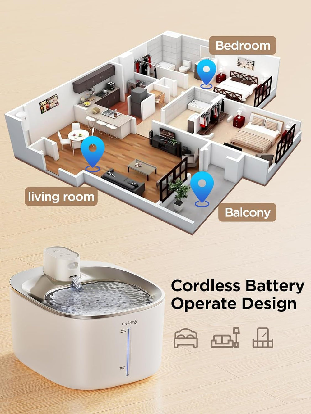 Kabelloser Katzenbrunnen Edelstahl mit Bewegungsmelder [Wasser-und Batterietrennung] FEELNEEDY Batte