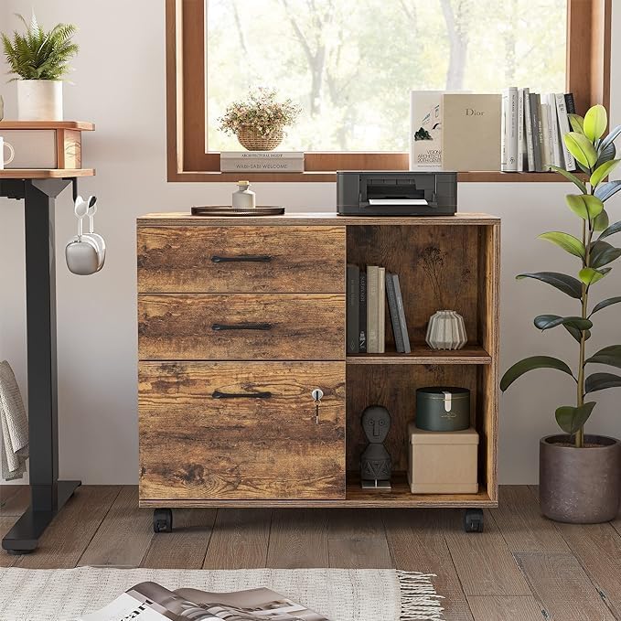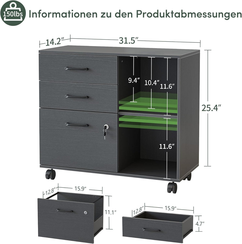 FEZIBO 3-Schubladen-Mobiler Aktenschrank, Seitenschrank mit Schloss, Druckerständer mit offenen Abla