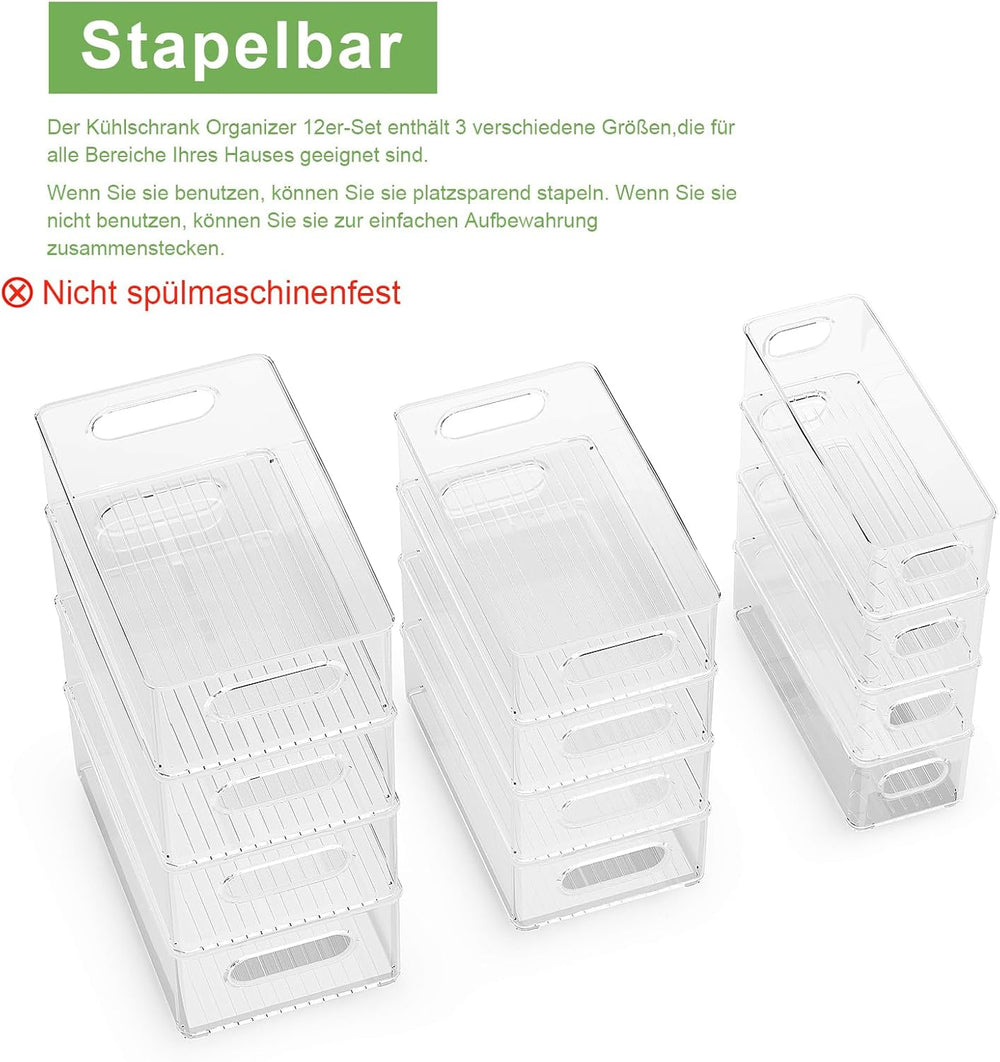 FINEW Kühlschrank Organizer 12er Set (4 Klein, 4 Mittel, 4 Gross), Stapelbar Kühlschrank Behälter, D