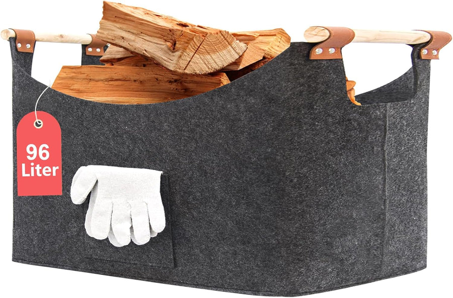 FINEW Holzkorb für Kaminholz 96L, Kaminholzkorb mit Handschuhen 60 x 40 x 40CM, Grosse Filzkorb Feue