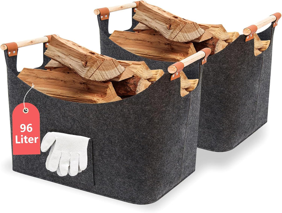 FINEW Holzkorb für Kaminholz 2 Stück, 96L Kaminholzkorb mit Handschuhen 60 x 40 x 40CM, Grosse Filzk