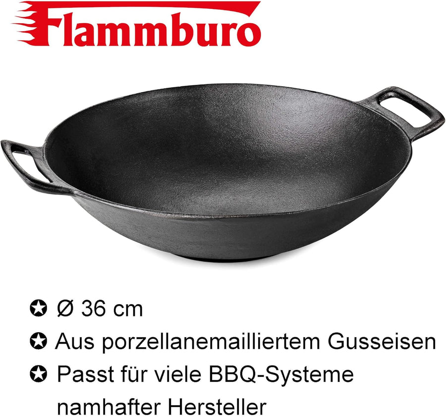 FLAMMBURO BBQ-SYSTEM Wok Ø 36 cm – Gusseisen mit porzellanemaillierter Beschichtung – Für Gemüse und