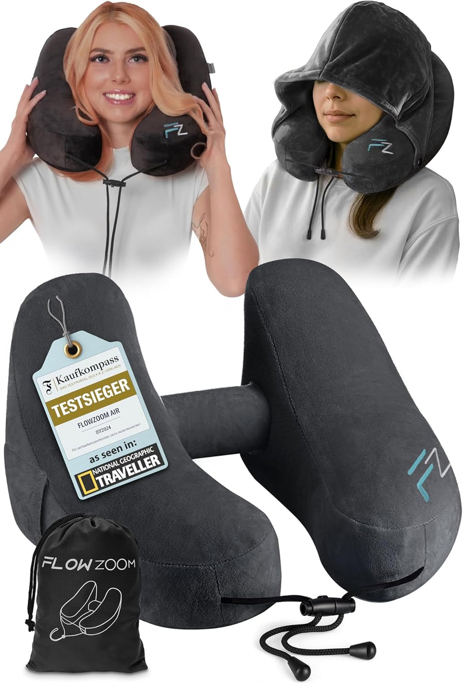 FLOWZOOM AIR Nackenkissen aufblasbar mit Kapuze - Reisekissen - Schnell aufblasbares Reise - Flugzeu
