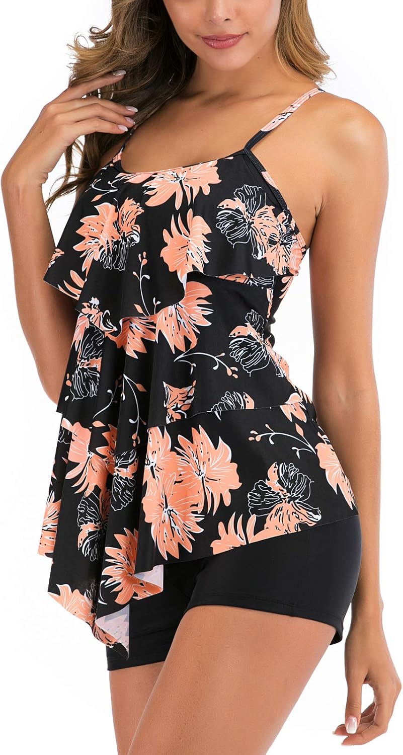 FLYILY Damen Zwei Stücke Tankini Rüschen Volant Geschichtet Bademode mit Boy Legs Shorts Rüschen Gro