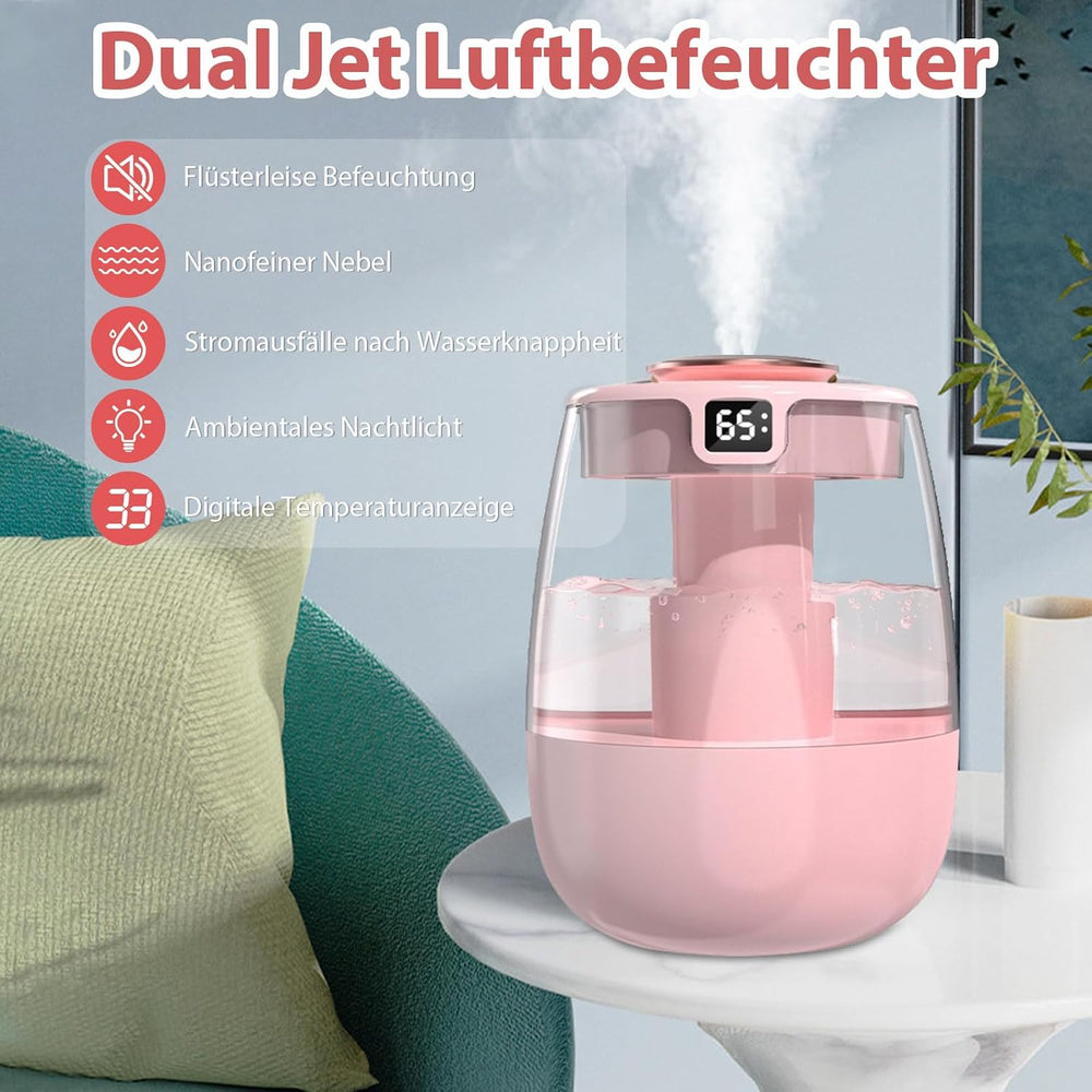 Luftbefeuchter, 1L Leise Humidifier mit 2 Loch, Luftbefeuchter mit leiser USB-Digitalanzeige, 2 Nebe