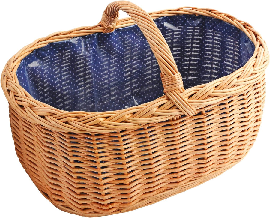 Grosser Einkaufskorb / Autokorb aus Weide mit Henkel und Stoffeinlege in Blau mit punkten oval Typ