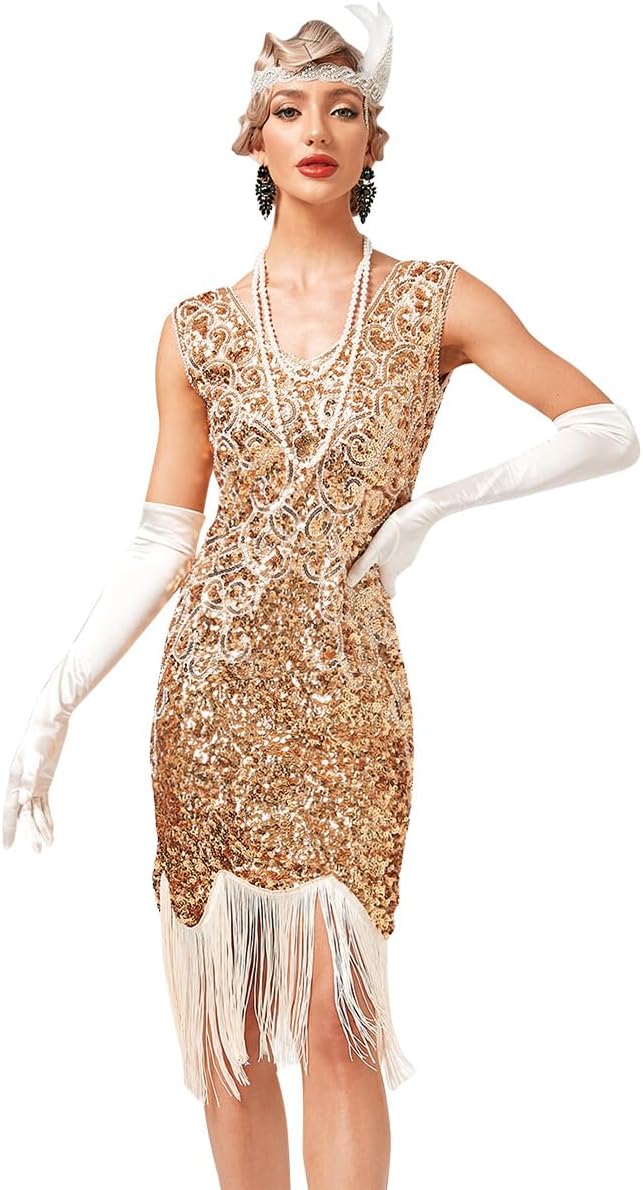 FYMNSI Damen 1920er Jahre V-Ausschnitt Pailletten Fransen Kleid Flapper Charleston Kleider Cocktailk