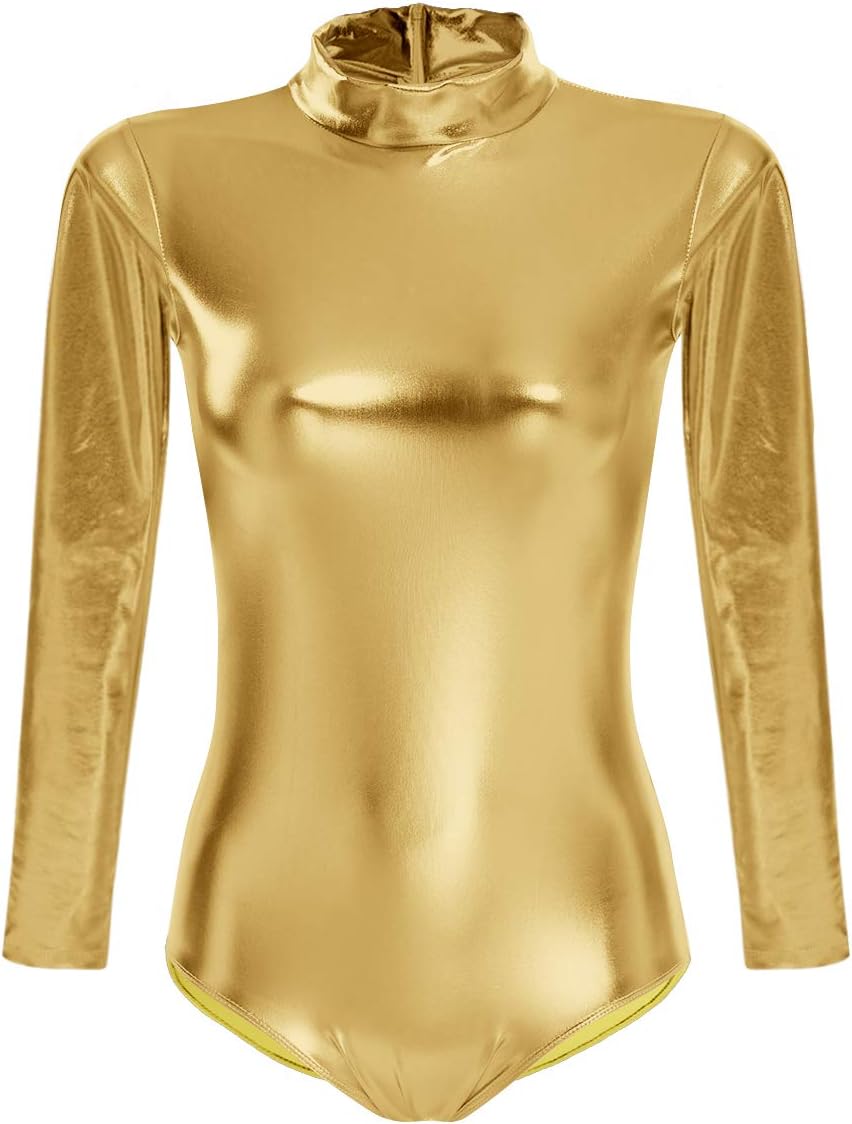 FYMNSI Damen Glänzende Ballettanzug Ballettbody Sport Tanz Body Gymnastikanzug Trikot Langarm Bodysu