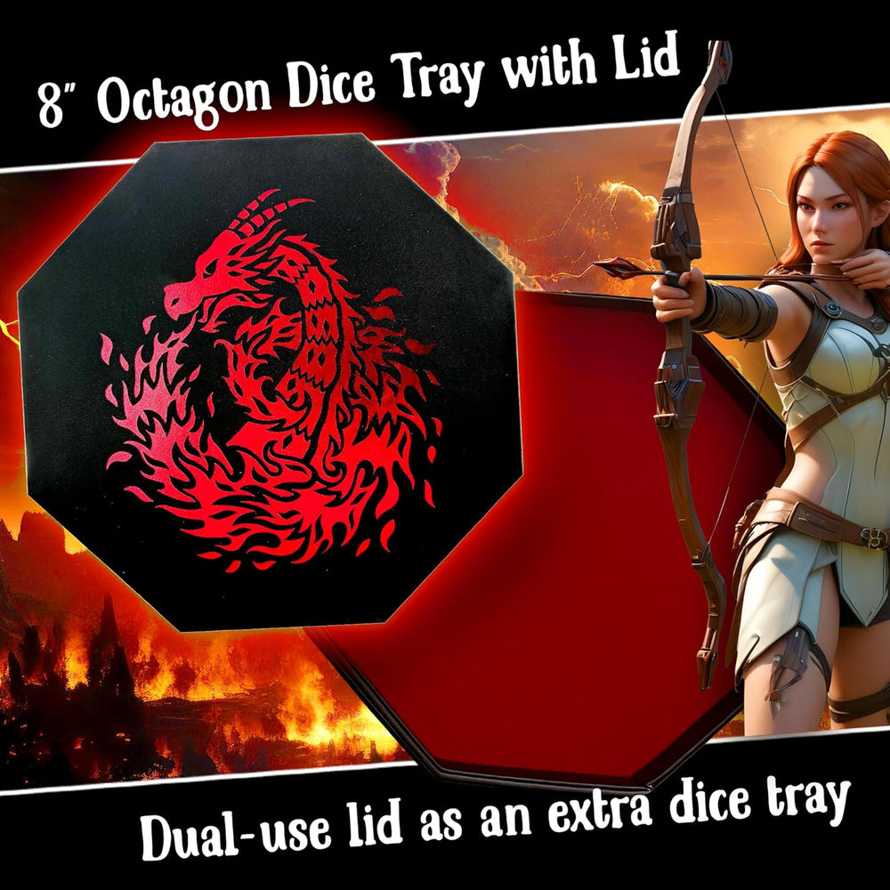 Fantasydice - Rot - Feuerdrache - Würfeltablett - 20,3 cm achteckig mit Deckel und Würfelfel-Bereich