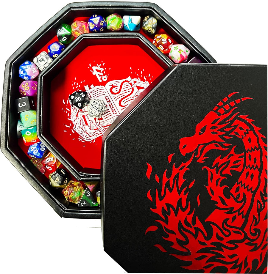 Fantasydice RED Fire Dragon with Wizard Book Print Dice Tray 8" Octagon with Lid and Dice Staging Ar