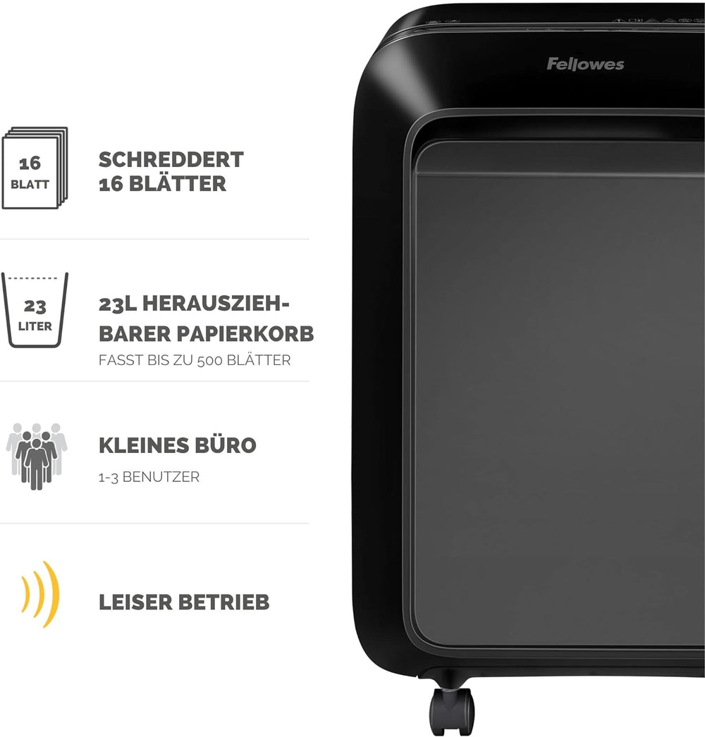 Fellowes 16 Blatt Aktenvernichter Partikelschnitt (P4), Papierschredder für Büro, Homeoffice, Powers