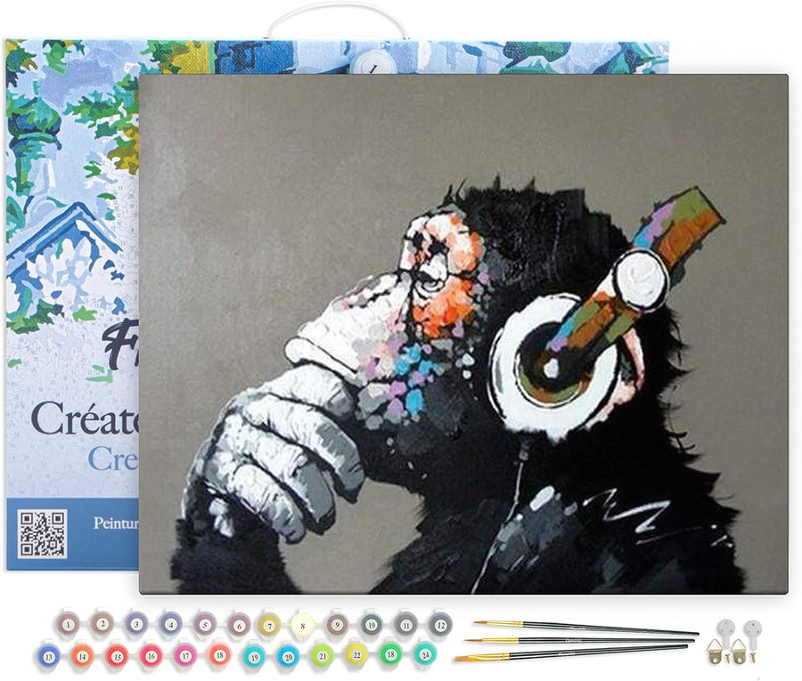 Figured'Art Malen Nach Zahlen Erwachsene Mit Rahmen Affe mit Kopfhörer - Paint by Numbers Basteln DI