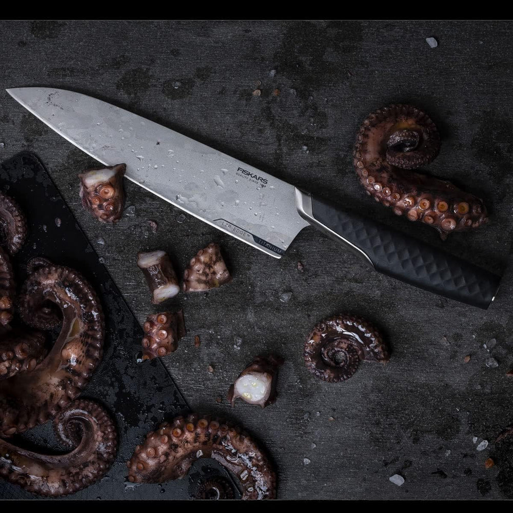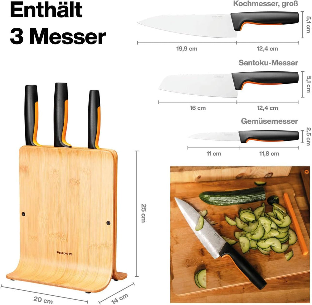Fiskars Bambus Design-Messerblock mit 3 Messern, Functional Form, Inklusive Gemüsemesser, Santoku Ko