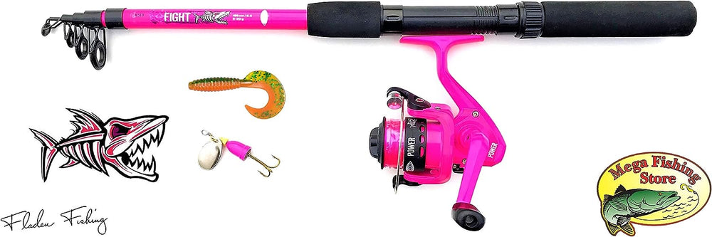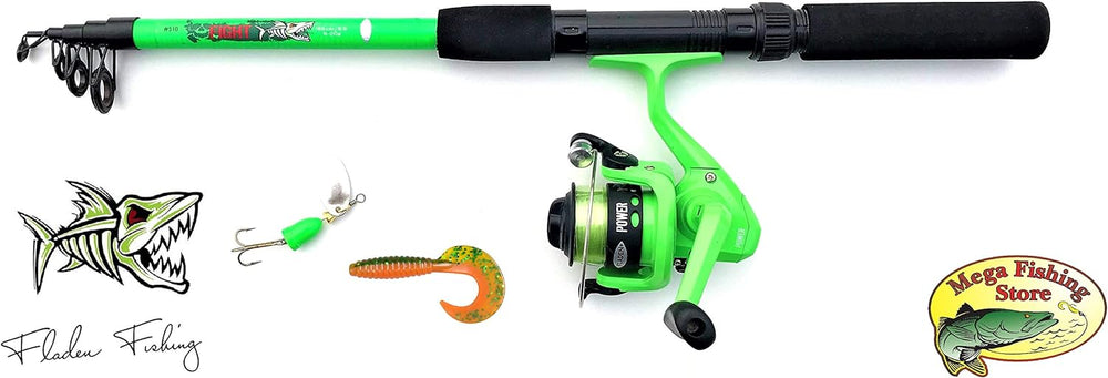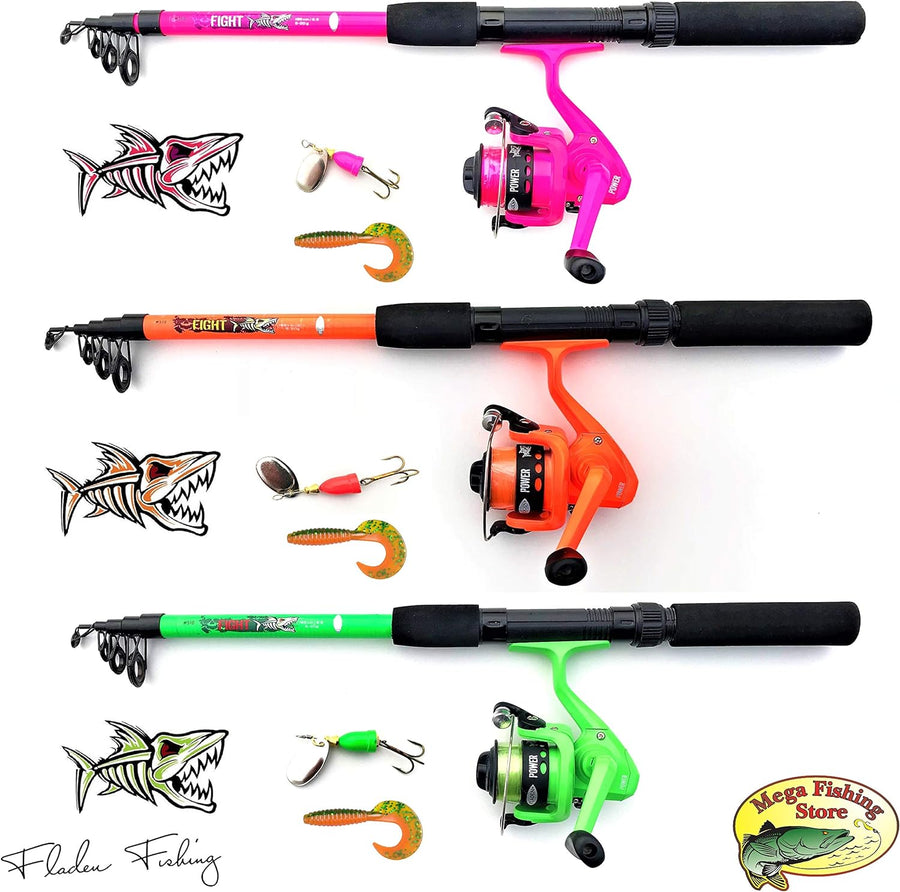 Fladen Kinderangel Starter Set Tele Spinning Combo Grün/Orange/Pink Teleskop Rute Rolle Schnur Spinn