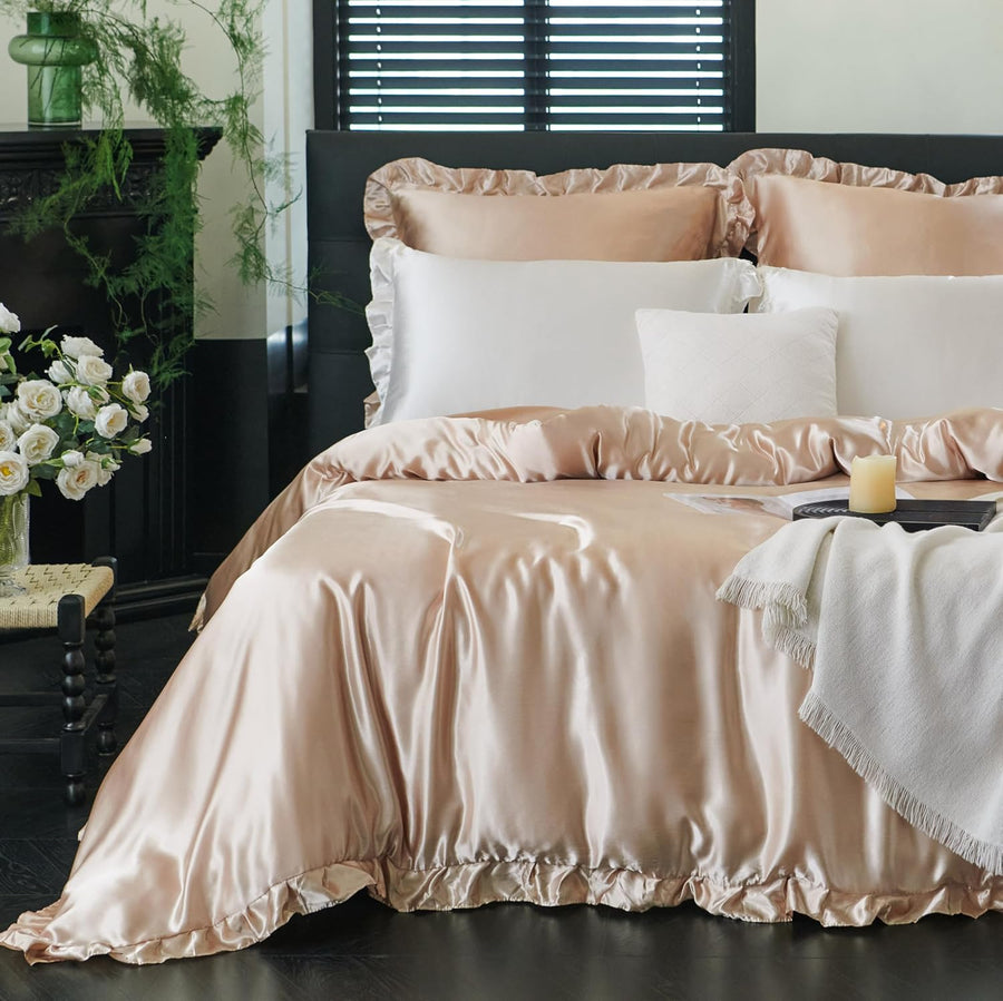 Freyamy Bettwäsche 135x200 Glatt Luxus Seide Bettwäsche Set Khaki Champagne Einfarbig Rüschen Romant