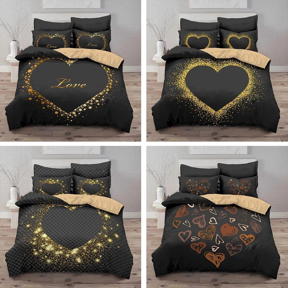 Freyamy 3D Aesthetic Bettwäsche 220x240cm 3teilig Schwarz Gold Herzmotiv Liebe Modern MikrofaserKind