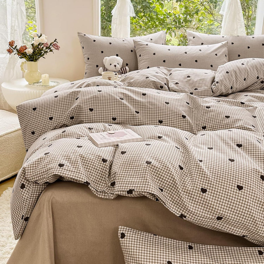 Freyamy Bettwäsche 135x200cm 2teilig Khaki Braun Herz Kariert Wendebettwäsche Liebe Gitter Bettwaren