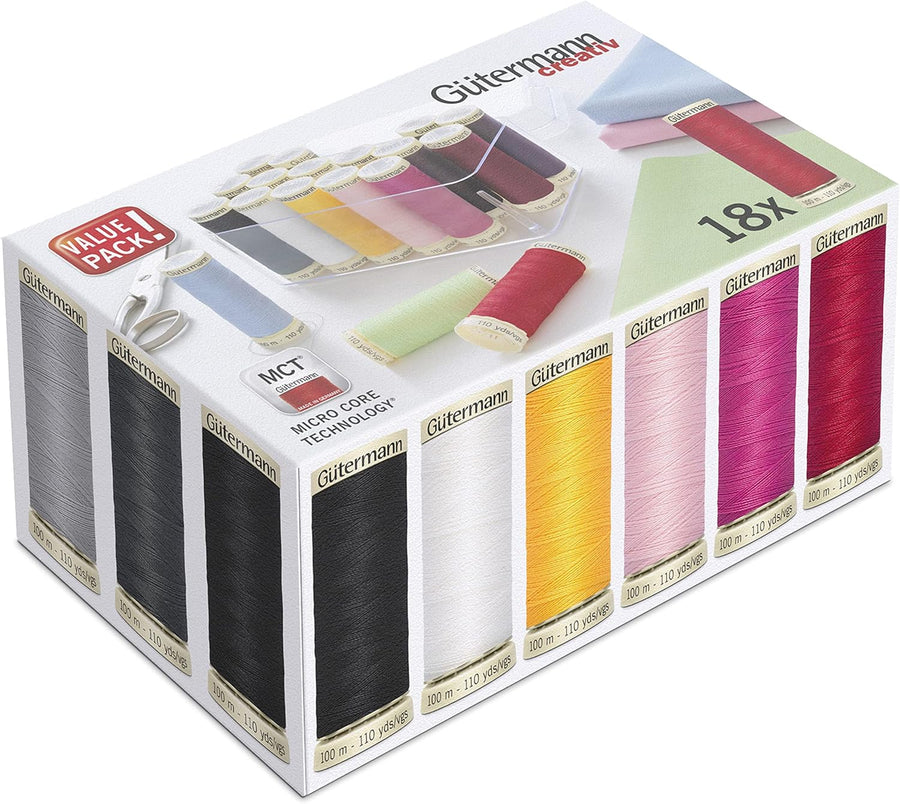 Gütermann creativ Nähfadenbox mit 18 Spulen Allesnäher 100 m in einer transparenten Aufbewahrungsbox