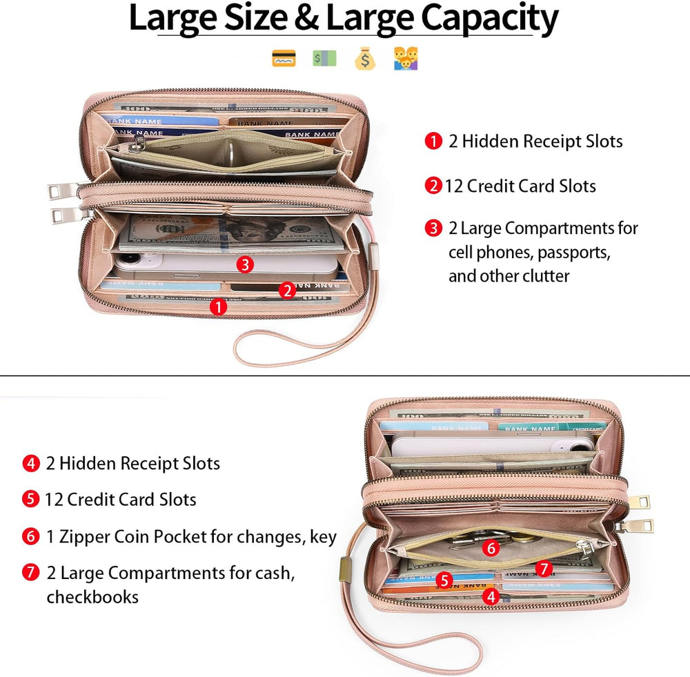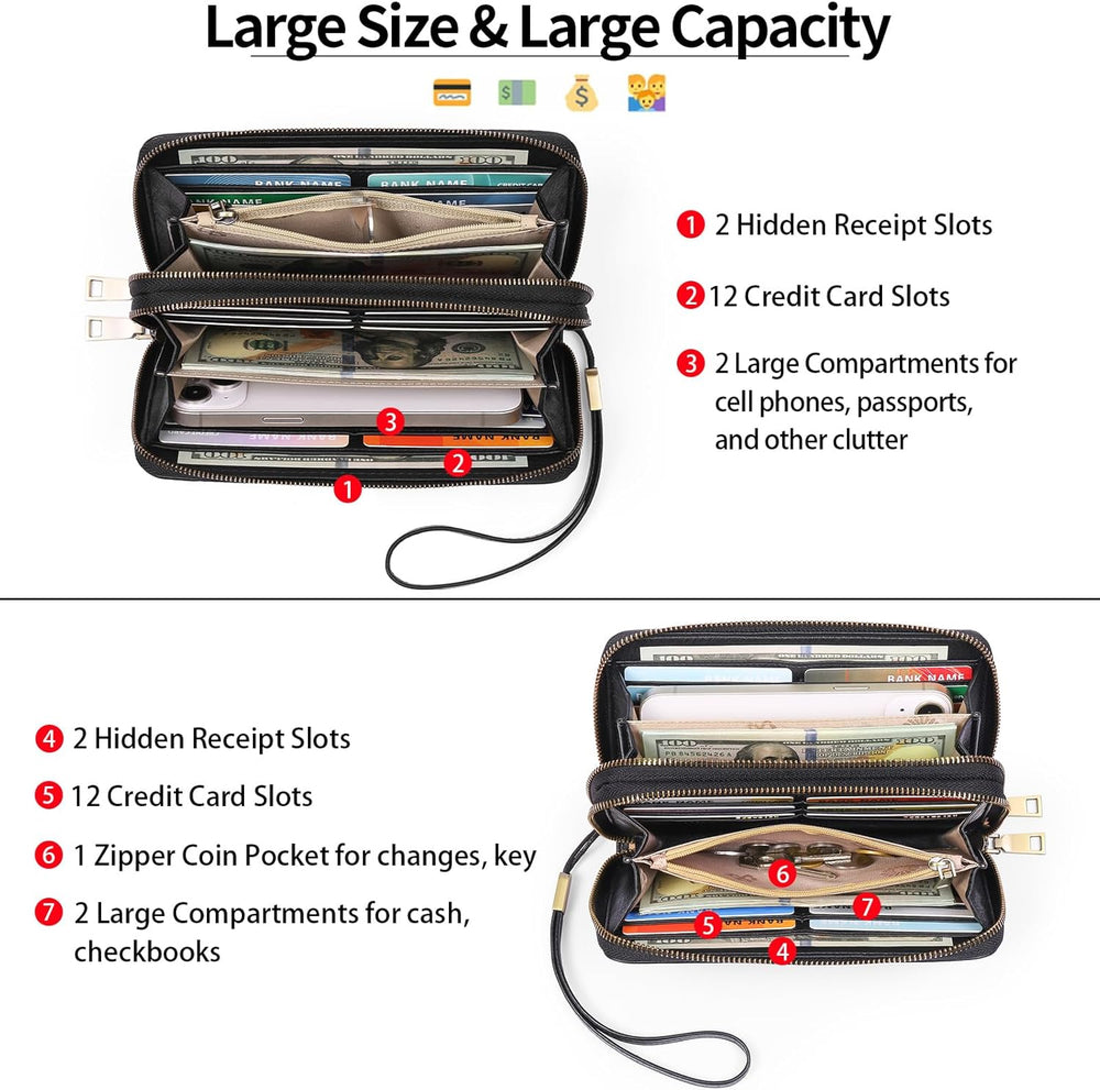 GAEKEAO Geldbörse Damen Gross, Portemonnaie Damen Veganes Leder Doppel Reissverschluss Kreditkartene