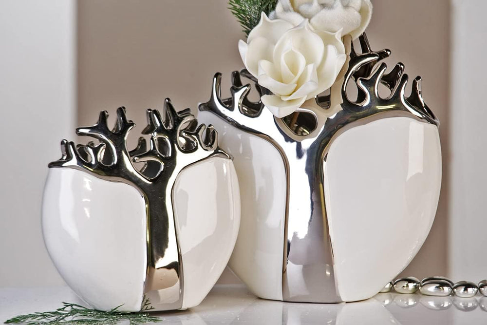 GILDE - Vase Tree - Keramik - weiss mit silbernem Baumdesign - Dekovase - Höhe 21 cm