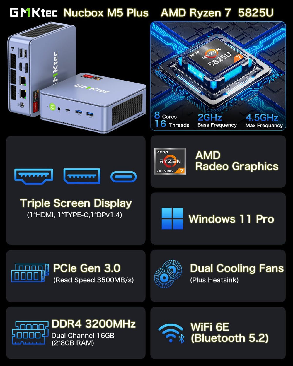 GMKtec Mini-PC 5825U, M5 Plus Dual LAN 2.5G Desktop-Computer Windows 11 Pro, AMD Ryzen 7 5825U (8 C/