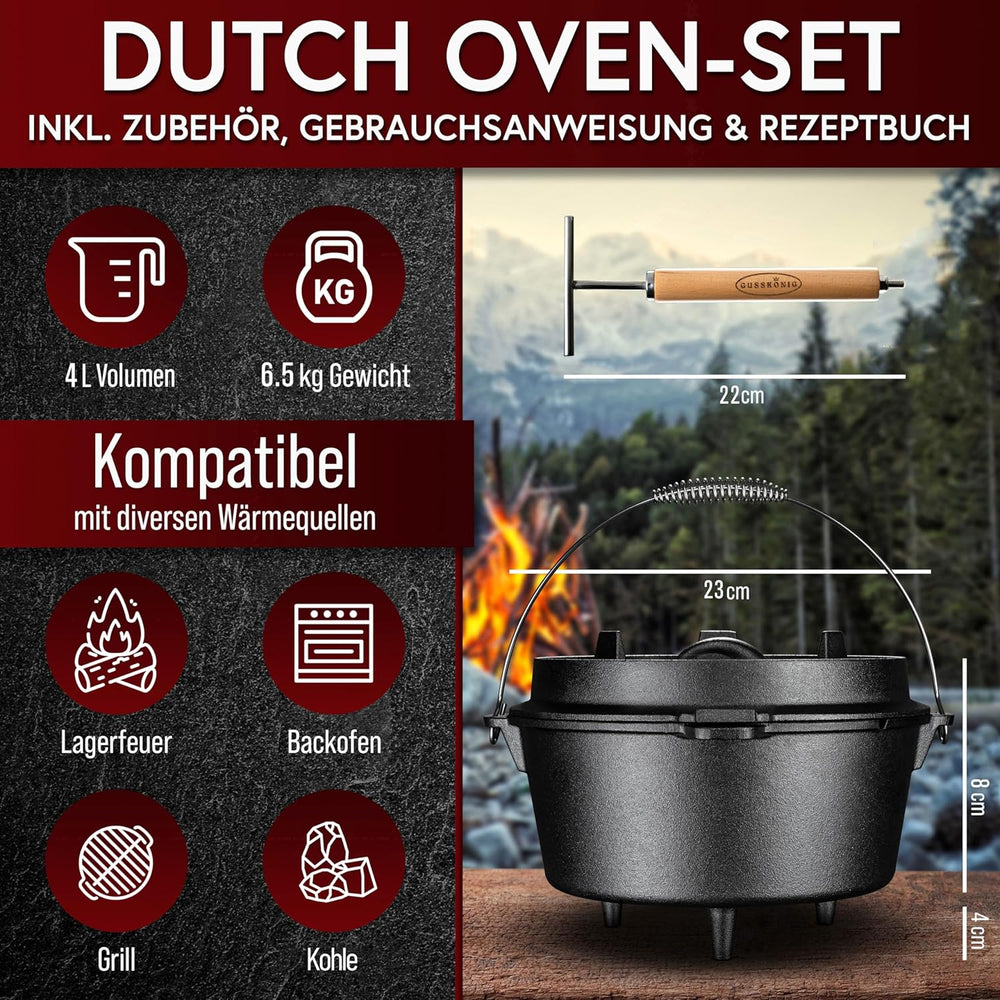 GUSSKÖNIG Dutch Oven Set - Eingebrannter Dutch Oven 4 Liter - Feuertopf Gusseisen mit Füssen - Schmo
