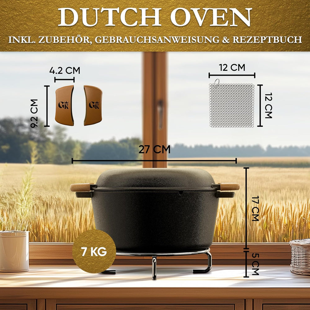 GUSSKÖNIG Dutch Oven Set [7L ] - Eingebrannter Feuertopf mit praktischem Deckelheber und Edelstahl U