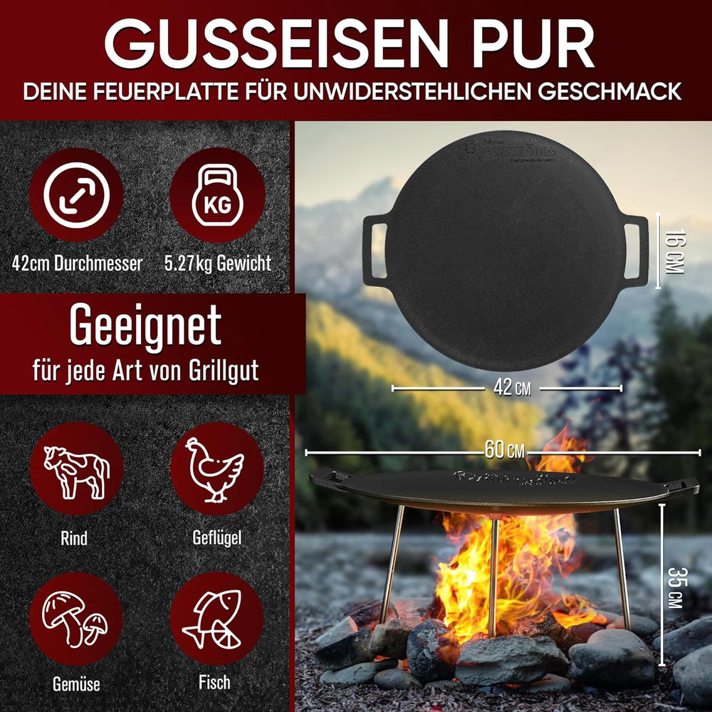 GUSSKÖNIG Gusseisen Grillplatte (Ø 42 cm) mit 3 Edelstahl Beinen - Dutch Oven Grillplatte Gusseisen