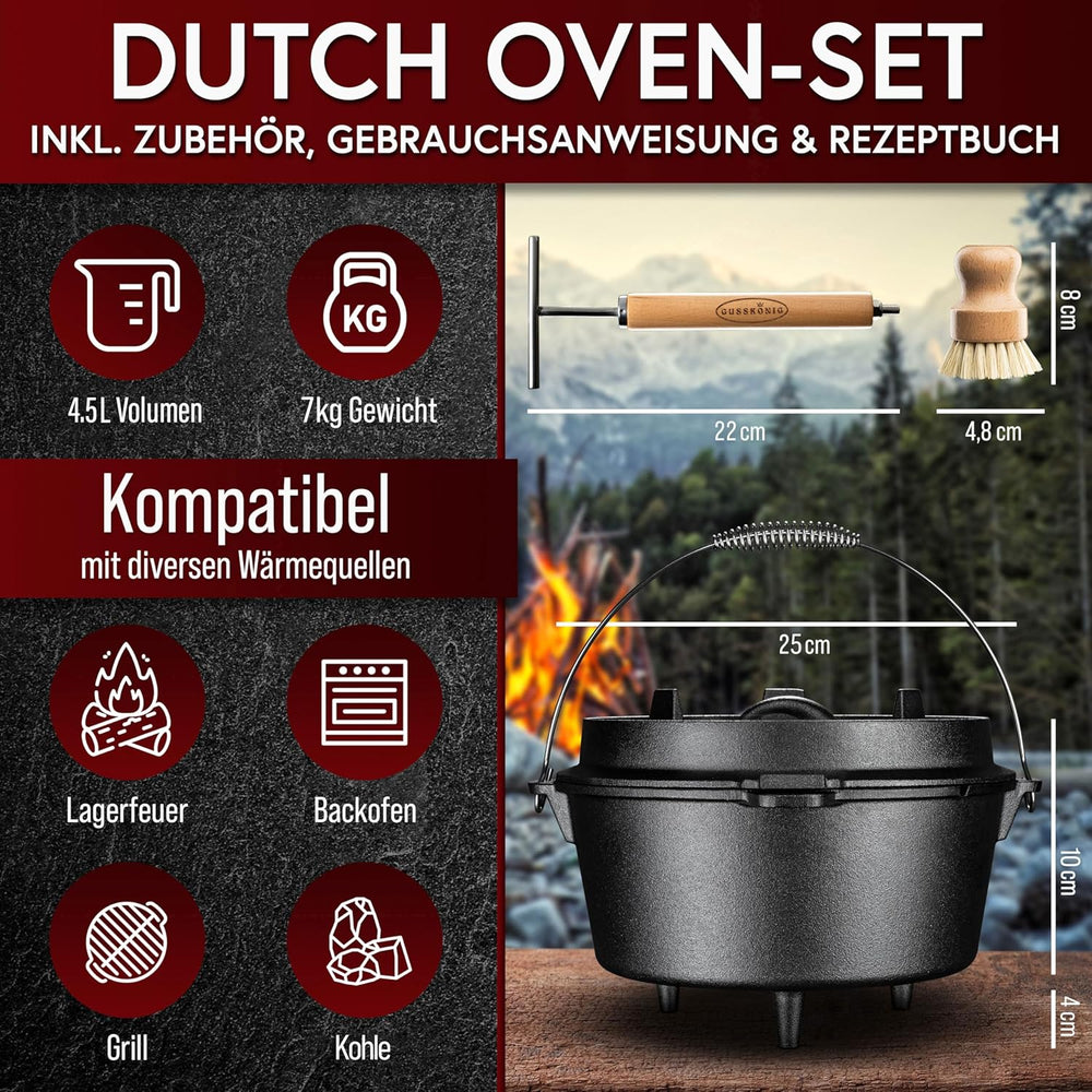 GUSSKÖNIG Dutch Oven Set - Eingebrannter Dutch Oven 4,5 Liter - Feuertopf Gusseisen mit Füssen - Sch