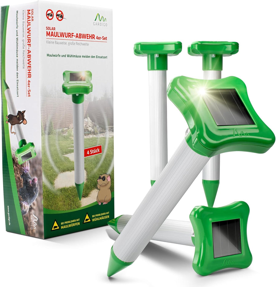 GARDIGO® Maulwurfvertreiber mit Solar und integriertem Akku 4er Set I Maulwurfschreck I Wühlmausvert