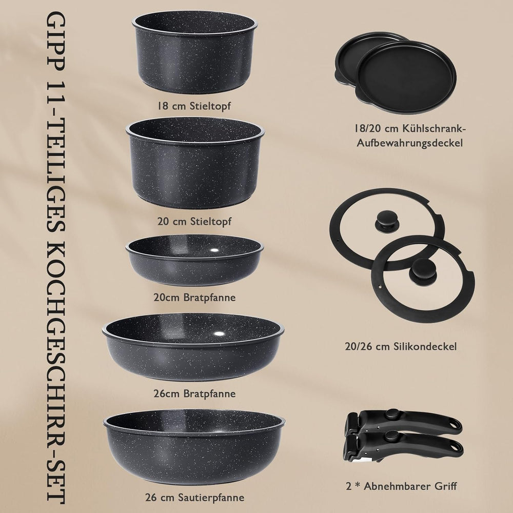 GiPP Keramik Topfset mit Abnehmbarer Griff, 11-Teilig Topf und Pfannenset mit Antihaft Beschichtet,
