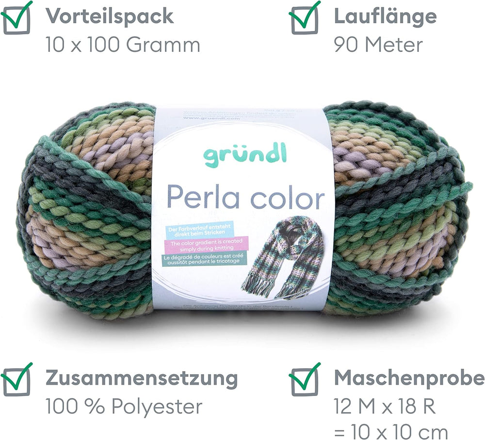 Gründl 3354-27 Perla Color Wolle, 100% Polyester, grasgrün-aubergine-cremerosa multicolor, 40 x 20 x
