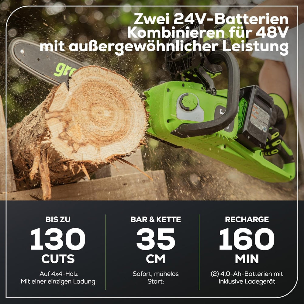 Greenworks 48V(2x24V) Akku Kettensäge mit bürstenlosem Motor, 14-Zoll (35 cm) Klinge, 20 m/s Ketteng