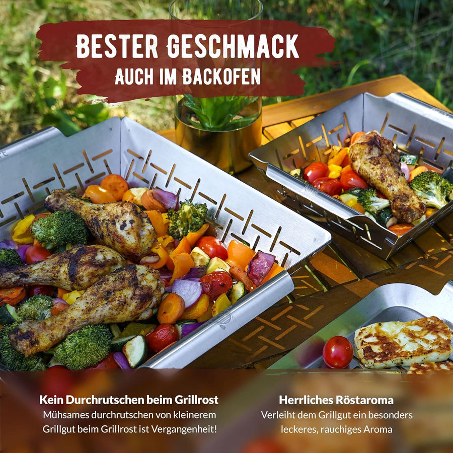 grillart® Premium Grillschale Edelstahl (2er Set), Fisch Grillkorb und Grillschale für Spiesse verwe