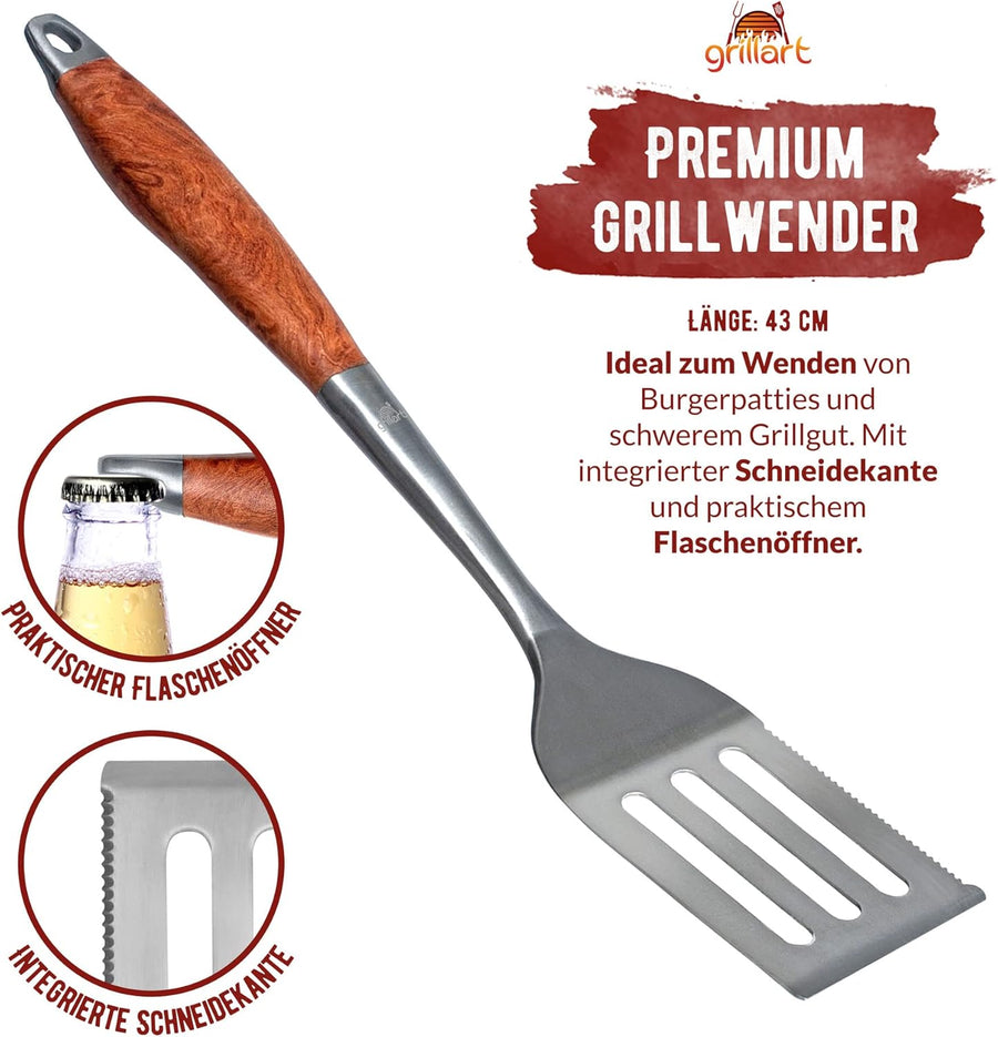 grillart® Premium Grillbesteck Set, 3-teilig aus hochwertigem Edelstahl und edlen Holzgriffen – Gril