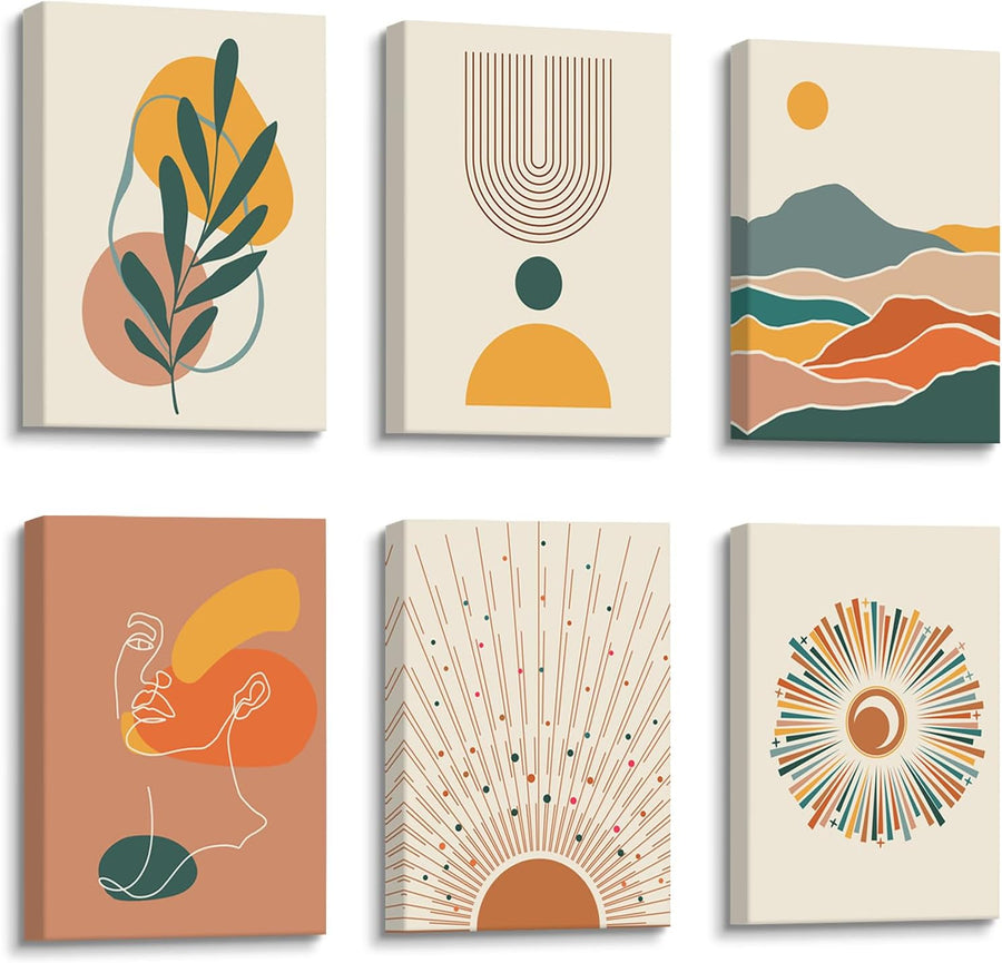 6Pcs Leinwand Bilder Set Mit Rahmen Boho Beige Geometrische Linien Bild auf Leinwand Bohemian Bunte