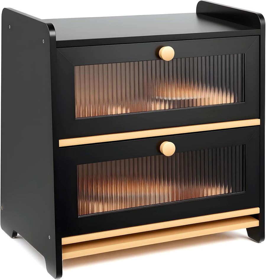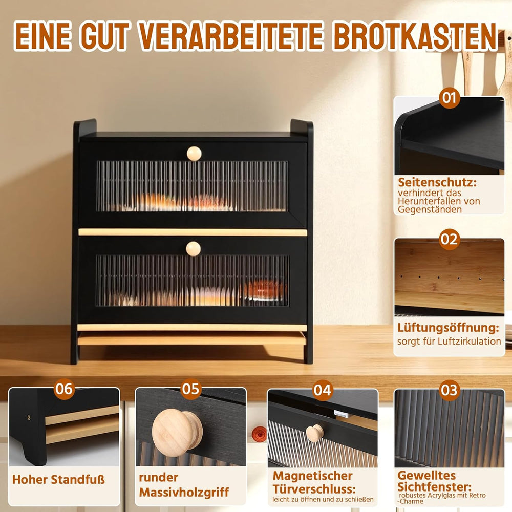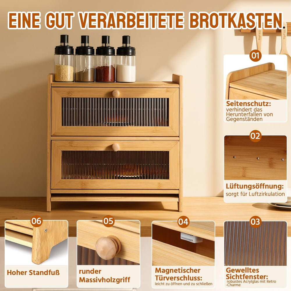 HAUSPROFI Brotkasten Bambus 2 Etagen, Brotkästen Holz mit Schneidebrett Belüftung Gewelltes Sichtbar