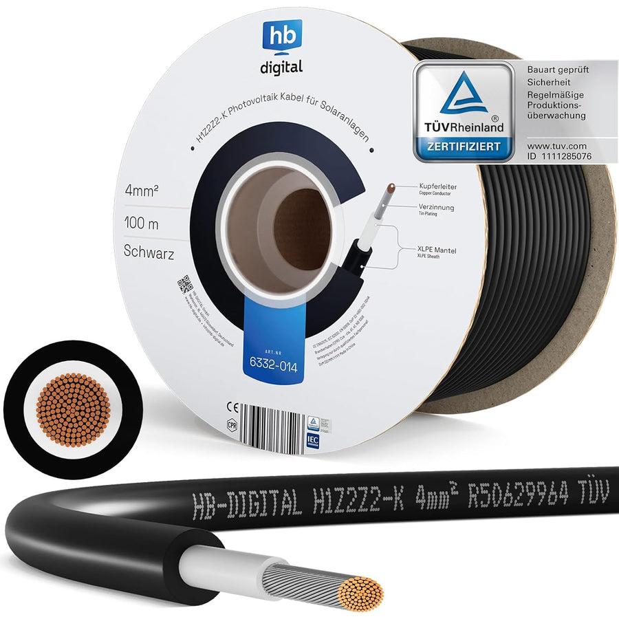 hb-digital 100m Solarkabel H1Z2Z2-K TÜV Rheinland geprüft 6mm2 UV-beständig flexibel PV Kabel Reines