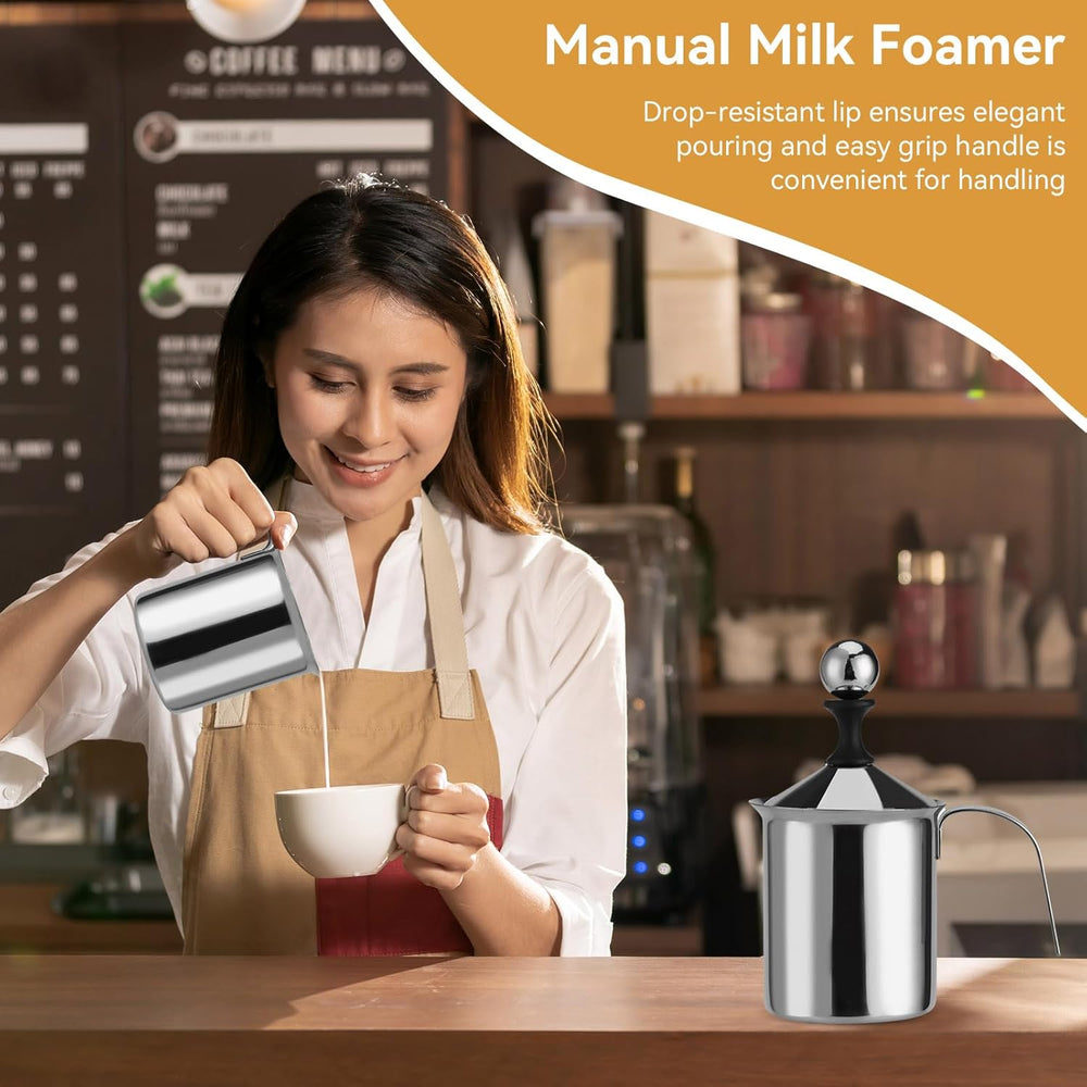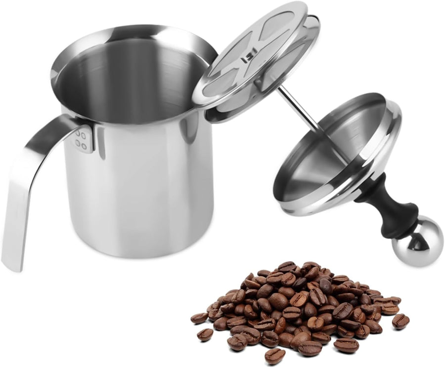 800ml de Acero Inoxidable Leche Manual Frother, Espumador Leche con Doble Colador, Jarra espumadora