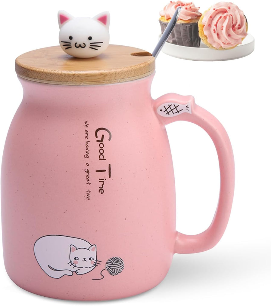 420 Ml Katzen Tasse Geschenk Tasse mit Edelstahl Löffel und Holzdeckel Kaffee Wasser Milch Becher (R