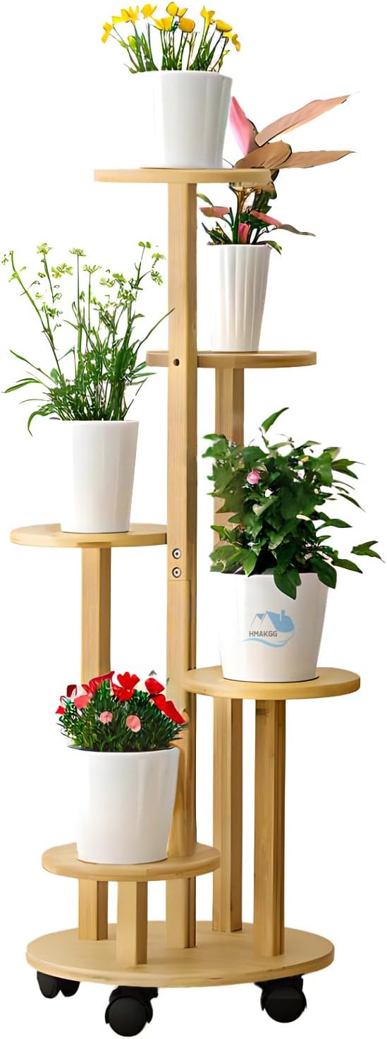 HMAKGG Blumenständer Bambus mit Rollen, 5 Etagen Pflanzenständer 90CM Blumenregal Balkon, Blumentrep
